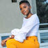 Bridgit Juma in a Hand pleated satin pants and shirred top.