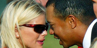 Golfer Tiger Woods shares a moment with Elin Nordegren during the opening ceremony for the 35th Ryder Cup matches in Bloomfield, Michigan in this September 16, 2004 file photo.