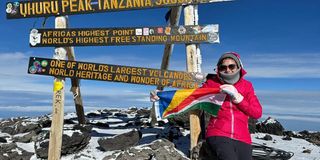Catherine Rose at Uhuru Peak, Mt. Kilimanjaro on March 17, 2025.