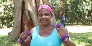 Cecilia Maingi, a retiree, during a workout session at Karura Garden in Nairobi on March 14, 2025.