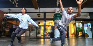 Eric Gitau(left) and Steve Bulinda Kiboga under project Mviringo Breaking Academy, showcase their dance moves at Alliance Francaise, Nairobi on August 8, 2024.