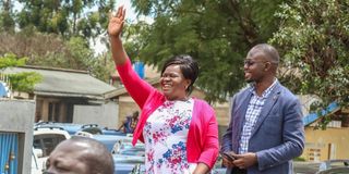 Homa Bay Women rep Gladys Wanga waves to delegates chaired by ODM leader Raila Odinga in Nakuru on August 18, 2021. Photo | Pool