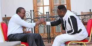 President Uhuru Kenyatta chats with musician Roy Smith Mwatia popularly known as Rufftone at State House, Nairobi on February 8, 2017. PHOTO | PSCU