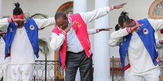 President Uhuru Kenyatta joins FBI Dance Crew in a dance to encourage the youth to register as voters at State House, Nairobi on February 8, 2017. PHOTO | PSCU