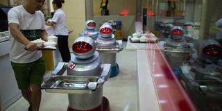This photo taken on August 13, 2014, shows a robot being loaded with food to bring to customers in a restaurant in Kunshan. It's more teatime than Terminator -- a restaurant in China is electrifying customers by using more than a dozen robots to cook and deliver food. AFP | PHOTO