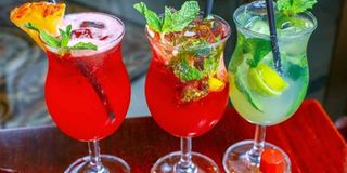 An assortment of some of Kilimanjaro non-alcoholic beverages. From left; the red collar mocktail (strawberry, sprite and pineapple juice), strawberry nojito (strawberry and mint) and mint nojito (mint and lemon).