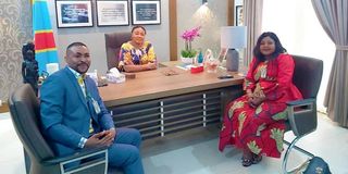 DRC Congo First Lady Denise Nyakeru Tshisekedi (centre) meets Congolese musician Mbilia Bel (right) and her manager Jules Nsana in her office in Kinshasa.