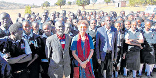 Rhodia Mann with the school’s students when the library was opened. PHOTO| COURTESY