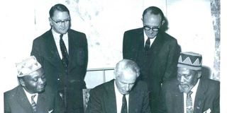 Then Kenya Governor Malcom MacDonald signing the proclamation which brought Kenya’s new constitution into effect on May 31, 1963. On his left is the Prime Minister Jomo Kenyatta on his right, Kadu President Ronald Ngala. Standing are the Attorney-General A.M.F Webb (left), and the Deputy Governor, Sir Eric Griffin-Jones.