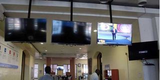 Blank screens of leading television stations NTV, Citizen and KTN and a live K24 one in the Nation newsroom on January 30, 2018.