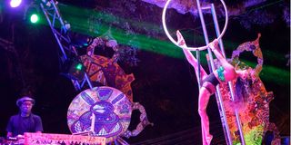 An acrobat hangs from a pole as DJ Saint Eve plays music in the background at Kilifi New Year Festival held at Beneath The Baobabs, Kilifi County.