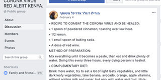 Groups like Kilimani Mums udaku zone,Kenya political forum and Group Kenya are routinely found to contain false information being posted by several Facebook users about the coronavirus.