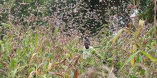 A farmer attempts to scare desert locusts from his farm in Masaku, Machakos. JOSEPH KANYI | NATION