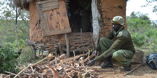 Administration Police and Kenya Wildlife Service officers at one of seven huts along the Laikipia and West Pokot border where a total of 14 tonnes of sandalwood was seized in 2016. STEVE NJUGUNA | NATION