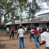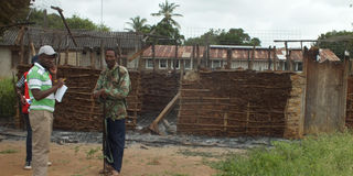 Pandanguo residents near a dispensary, nursery school and other structures that were burnt by armed gunmen who attacked the village in December 2014.