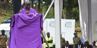 Bishop Paul Korir of Anglican Church of Kenya, Kapsabet Diocese, during a burial service of the late Kelvin Kiptum, the World Marathon Record Holder held at Chepkorio Showground in Keiyo South, Elgeyo Marakwet County on February 23, 2024. Kiptum died together with his coach Gervais Hakizimana following a road crash at Flax on the Eldoret-Kaptagat-Eldama Ravine road.