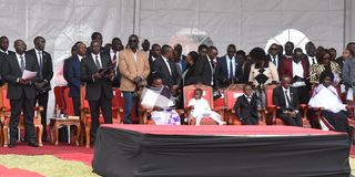 President William Ruto second (left), Deputy President Rigathi Gachagua (left), the family of the late Kelvin Kiptum, the World Marathon Record Holder, during a burial service at Chepkorio Showground in Keiyo South, Elgeyo Marakwet County on February 23, 2024. Kiptum died together with his coach Gervais Hakizimana following a road crash at Flax on the Eldoret-Kaptagat-Eldama Ravine road.