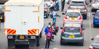 Hawkers selling their merchandise to motorists stuck in a traffic jam along Thika Road in Nairobi on September 30, 2025. The heavy traffic has provided hawkers with increased opportunities to sell their goods, as the prolonged congestion keeps motorists stationary and more receptive to purchasing items