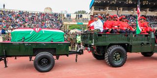 Men and women clad in branches and twigs thronged into the historic stadium to witness the departure of the father of democracy at Nyayo Stadium.