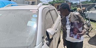 Ms Rebecca Wanzala peeks at his missing husband's vehicle at the Kitengela Police station on April 8 2026.