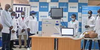 Kenyatta University students with their ventilator at the Chandaria Business Innovation and Incubation Centre on April 11. PHOTO | FILE