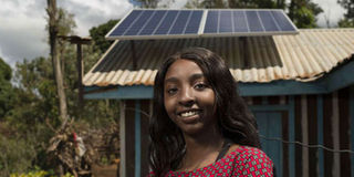 Tracy Kimathi is pictured standing in front of a Tree-Sea-Mals mini grid on February 1, 2020. PHOTO | POOL | NATION MEDIA GROUP
