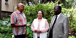 Association of Former International Civil Servants Kenya (AFICS) President Ambassador Dr John Kakonge (right) confers with AFCIS Deputy President Prof Linda Ethangatta and AFICS Member Michael Mwangi (left) during an interview on September 12, 2023 at Cedars Restaurant.