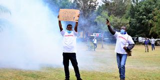 Police on Friday morning confronted protesters at freedom corner, Nairobi during a peaceful demo over the loss of Covid-19 funds.