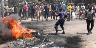 A member of the security forces removes obstacles from a road, during a demonstration in Kinshasa, Democratic Republic of Congo, January 28, 2025.