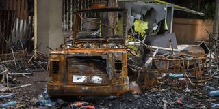 The remains of a burnt car which was set on fire by a mob during the violence after the assassination of Oromo's pop singer Hachalu Hundessa is seen in Shashamene, Ethiopia, on July 12, 2020. PHOTO | AFP