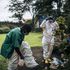Municipal workers dressed in protective gear rest while disinfecting a street in the Bab el-Oued district of Algeria's capital Algiers, during the Covid-19 coronavirus pandemic, on April 9, 2020.