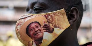 A supporter of the National Resistance Movement (NRM) wears a protective face mask printed with the portrait of President Yoweri Museveni as he celebrates the results of the presidential election in Kampala, Uganda, on January 16, 2021.