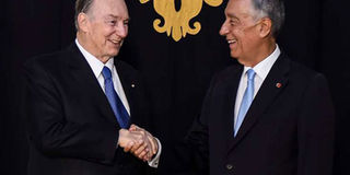 Portuguese President Marcelo Rebelo de Sousa (right) welcomes Prince Karim Aga Khan IV at Belem Palace in Lisbon on July 9, 2018. PHOTO | PATRICIA DE MELO MOREIRA | AFP
