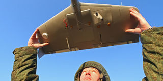 Serviceman of the Baltic fleet marines' reconnaissance group setting a Grusha unmanned air vehicle in flight at the Khmelevka military range, the testing grounds for air drones in this file photo.