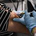 Nurse Ann Boraya vaccinates Amboseli National Park tour guide Daniel Kisipan against Covid-19 during a vaccination drive for frontline personnel in the tourism and hospitality sector, at the Kenyatta International Convention Centre on April 27, 2021.