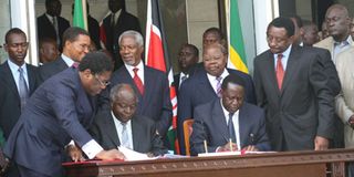 Former Attorney Genral Amos Wako (left) assists former President Mwai Kibaki as he and ODM Leader Raila Odinga sign the power-sharing pact. Looking on are former Tanzanian President Jakaya Mrisho Kikwete, Chief Mediator Kofi Annan and former Tanzanian President Benjamin Mkapa. PHOTO | FILE | NATION MEDIA GROUP