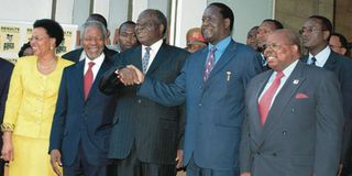 President Mwai Kibaki with ODM leader Raila Odinga during a press conference at Harambee House, Nairobi in 2008. Looking on from left is Graca Machel, Kofi Annan and former Tanzanian President Benjamin Mkapa.
