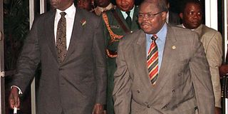 Tanzanian President Benjamin Mkapa (right) welcomes his Kenyan counterpart Daniel arap Moi on his arrival in Arusha on November 29, 1999. PHOTO | FILE | AFP