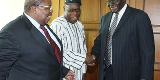 Former President Mwai Kibaki receives former Presidents Olesegun Obasanjo of Nigeria (centre) and Benjamin Mkapa of Tanzania (left) who called on him at his Harambee House office, Nairobi to appraise him on the situation in Eastern DR Congo back in January 2010. PHOTO | FILE | PPS