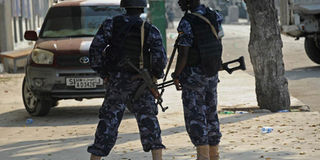 Security forces personnel stand guard on March 28, 2015 after a bomb attack on March 27 on the Makal Almukarama hotel in Mogadishu by Somalia's Al-Qaeda-affiliated Al-Shabaab militants. The death toll rose to 14, police said on March 28. PHOTO | MOHAMED ABDIWAHAB |