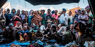 Internally Displaced People (IDP), fleeing from violence in the Metekel zone in Western Ethiopia, gather outside a tent where clothes are being distributed at a camp in Chagni, Ethiopia on January 26, 2021.