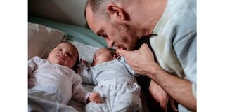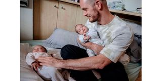 Phillip Lühl (right), from Namibia, sits in a bed with his new born baby twins, Paula (left) and Maya (centre) at their temporary accommodation in Auckland Park, Johannesburg, on April 14, 2021.