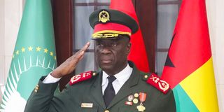 Major-General Horta Inta-a, the new transitional president, salutes during the swearing-in ceremony of Major-General Tomas Djassi as the new chief of staff of the Armed Forces in Bissau, Guinea-Bissau November 27, 2025.
