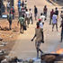A police officer throws a stone at protesters, during a mass protest the morning after preliminary results were released for five communes in Conakry on October 21, 2020.