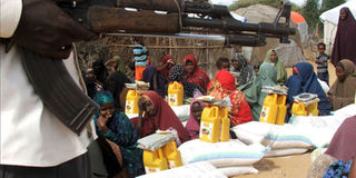 A Somali militia stands guard at a food distribution point on the outskirts of Somalia's capital Mogadishu, September 17, 2009. Somali insurgents detonated two suicide car bombs at an African Union (AU) peacekeeping base in Mogadishu on Thursday in what the rebels said was revenge for this week's US killing of a top al Qaeda suspect.