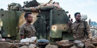 Ethiopian soldiers rest in front of the entrance to the 5th Battalion of the Northern Command of the Ethiopian Army in Dansha, Ethiopia, on November 25, 2020.