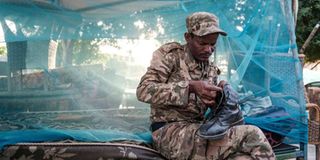 A member of the Amhara Special Forces fixes a boot at an improvised camp in front of a shop in Humera, Ethiopia on November 22, 2020.