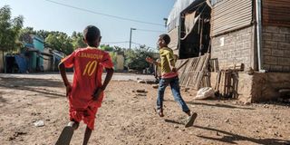 Children play next to the market in Humera, Ethiopia on November 22, 2020.