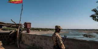 A member of the Amhara Special Forces on guard in Humera at the border crossing with Eritrea where an Imperial Ethiopian flag waves.