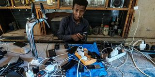 A young man charges phones at a bar in Humera, Ethiopia on November 22, 2020.